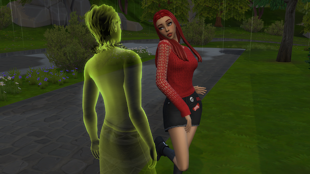 Roxxi: "I'm the only sim in this house that has experienced death. I'm so awesome." Nathaniel: "What a show-off." |